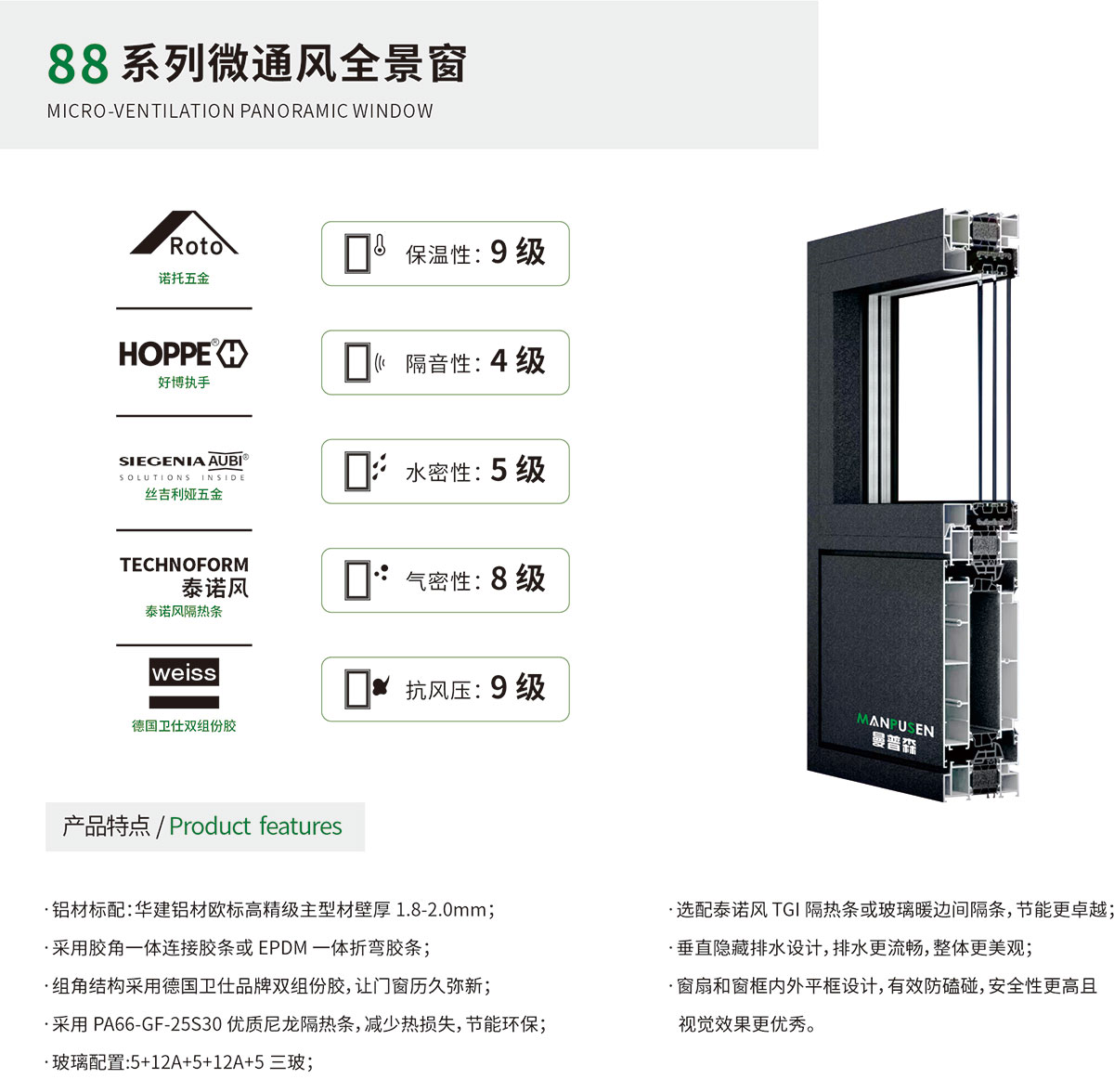 曼普森承诺,严格把控所有原材料供应,与山东华建铝材、江阴海达胶条,德国泰诺风隔热条,德国卫仕双组份胶、德国好博五金德国诺托五金、丝吉利娅五金等国内外优秀的公司达成长期战略合作关系。